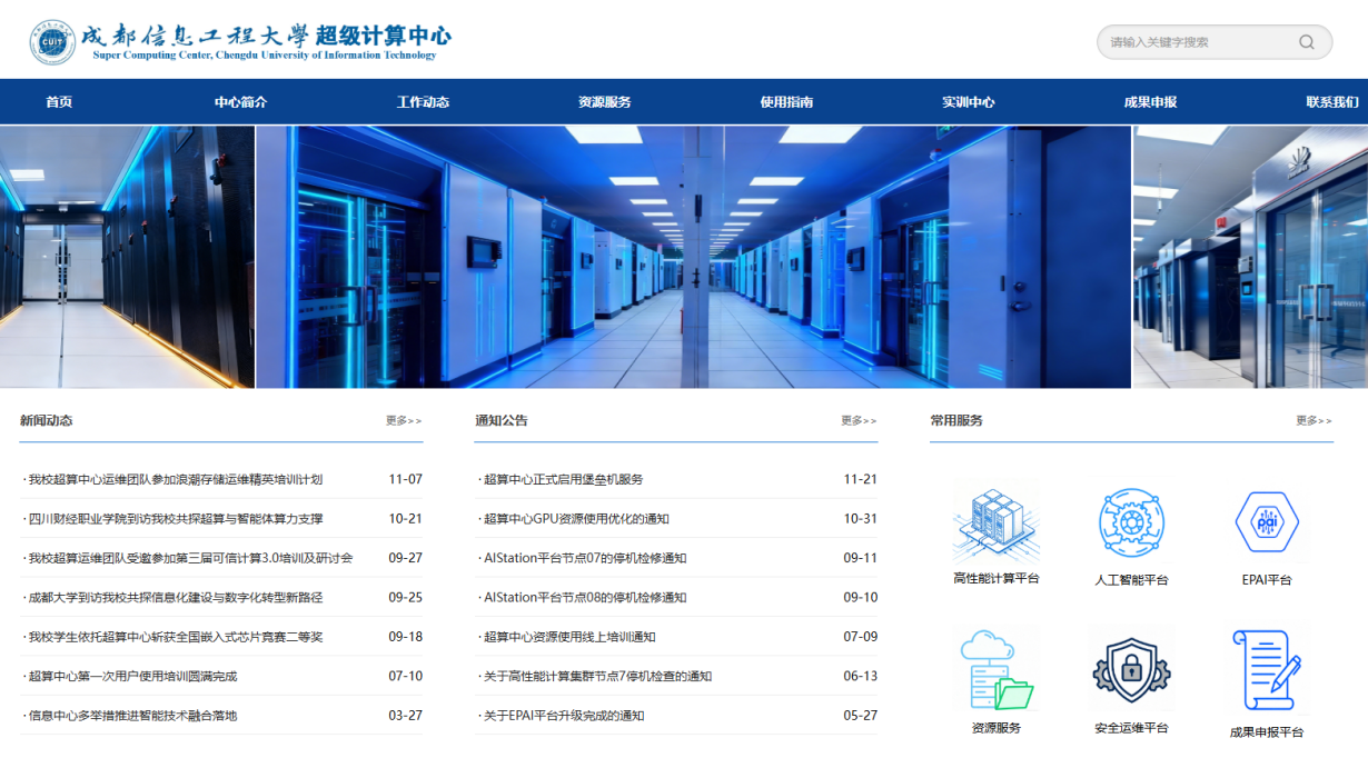 1.学校算力中心目前规模已达并行计算CPU 8160核、双精度浮点319Tflops,智算48张4090D GPU卡、40张H20 141G显存GPU卡、半精度浮点9400Tflops,并行计算存储2.5PB,云计算CPU 6000核、全闪存储400TB、普通存储6.5PB,改变了学校信息化基础设施长期落后的状况。