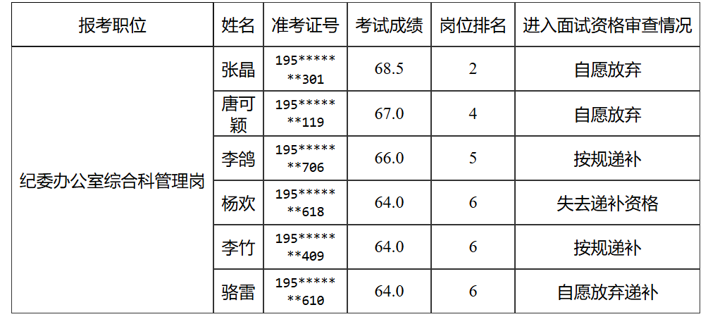 因本次公开选调中,纪委办公室综合科管理岗2人,自愿放弃面试资格审查,根据《成都信息工程大学关于2025年公开选调工作人员公告》,现递补2名考生进入面试资格审查,具体情况如下: