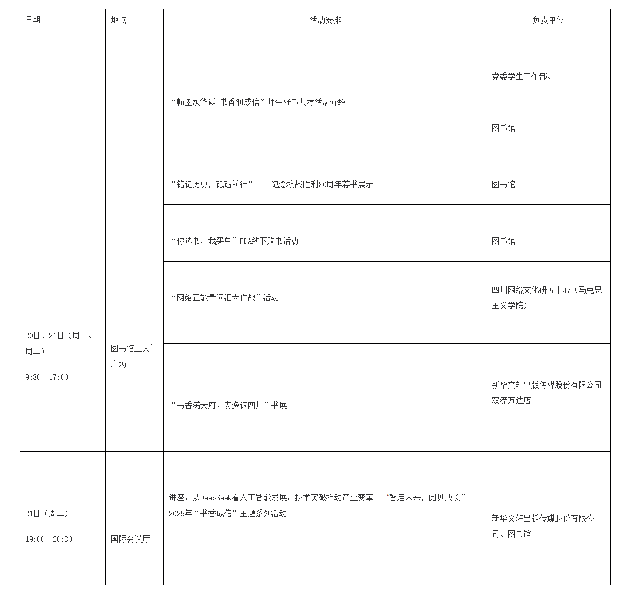 为进一步倡导全民阅读、终身学习的文明风尚,努力建设学习型社会,由四川省委宣传部指导、天府书展组委会主办的“天府书展进校园”活动将于10月20-21日在成都信息工程大学举行。学校图书馆在此背景下结合2025年度“书香成信”活动方案,设计了系列活动,期盼师生们在阅读中开阔视野,陶冶情操,提升文化素质。现将活动安排通知如下,欢迎广大师生积极参与!