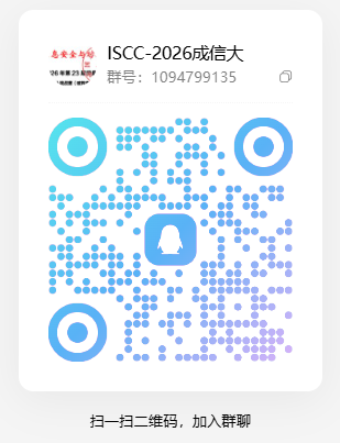 (2)组委会竞赛组QQ群:1092587911(ISCC-2026)或1081688510(ISCC-2026-2群)(供参赛者进行技术交流,严禁讨论解题方法或透露flag内容等)。
