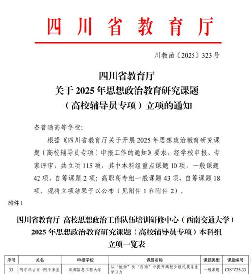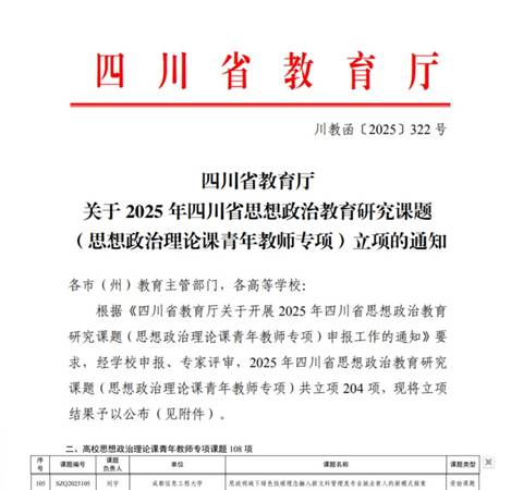 【本网讯】近日,四川省教育厅先后发布《关于2025年四川省思想政治教育研究课题(思想政治理论课青年教师专项)立项的通知》(川教函〔2025〕322号)与《关于2025年四川省思想政治教育研究课题(高校辅导员专项)立项的通知》(川教函〔2025〕323号),正式公布2025年四川省思想政治教育研究课题立项名单。其中,我校管理学院刘宇申报的《思政视域下绿色低碳理念融入新文科管理类专业就业育人的新模式探索》,获批思想政治理论课青年教师专项资助课题;学校少数民族专职辅导员阿尔祖古丽·阿卜来提申报的《从“他助”到“自助”中提升高校少数民族学生学习力》,成功获批高校辅导员专项一般课题。