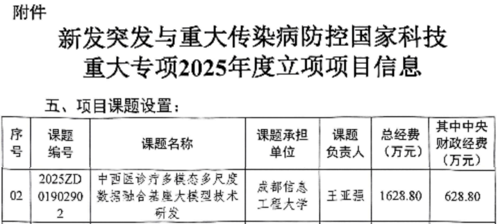【本网讯】近日,国家卫生健康委正式发布《新发突发与重大传染病防控国家科技重大专项2025年度立项项目立项通知》。我校作为牵头单位,成功获批“中西医诊疗多模态多尺度数据融合基座大模型技术研发”课题。