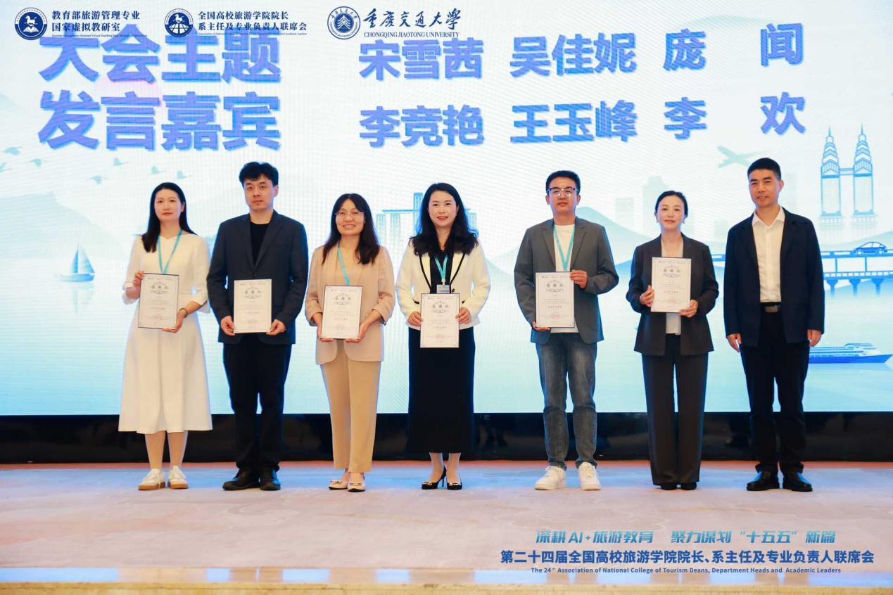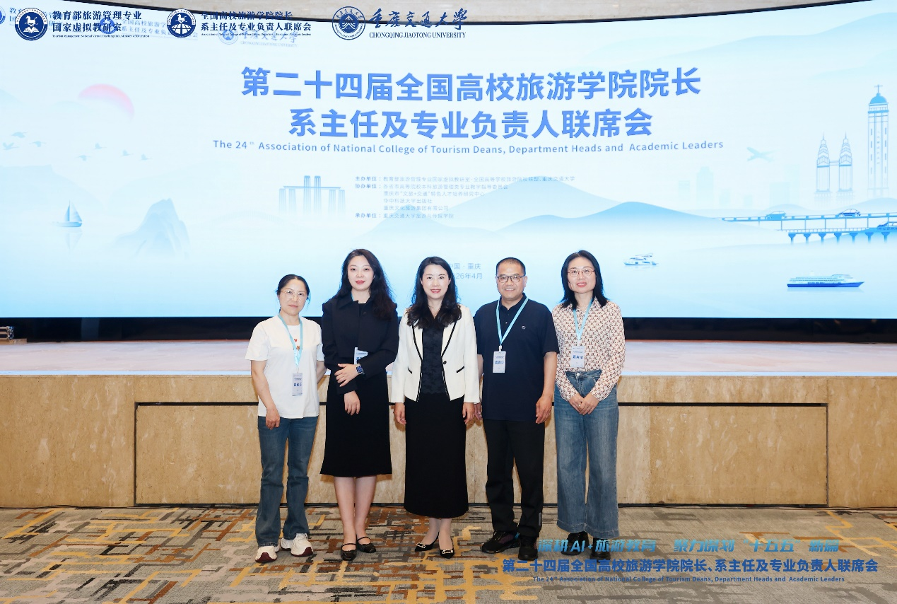【本网讯】4月11日至12日,第二十四届全国高校旅游学院院长、系主任及专业负责人联席会在重庆召开。本次会议由教育部旅游管理专业国家虚拟教研室、全国高等学校旅游院校联盟主办,重庆交通大学承办,吸引了来自全国百余所高校的旅游教育领域专家学者、院长及专业负责人300余人参会。会议围绕“人工智能+视域下‘十五五’高等教育改革革新与高质量发展”这一主题,设置了多场主旨报告、平行论坛及圆桌对话。我校智慧文旅学院院长宋雪茜教授、副院长吴双翼副教授以及旅游管理与市场营销系主任钱永贵副教授、艺术设计系彭琼博士和中国语言文学系主任刘洁副教授参加了此次盛会。