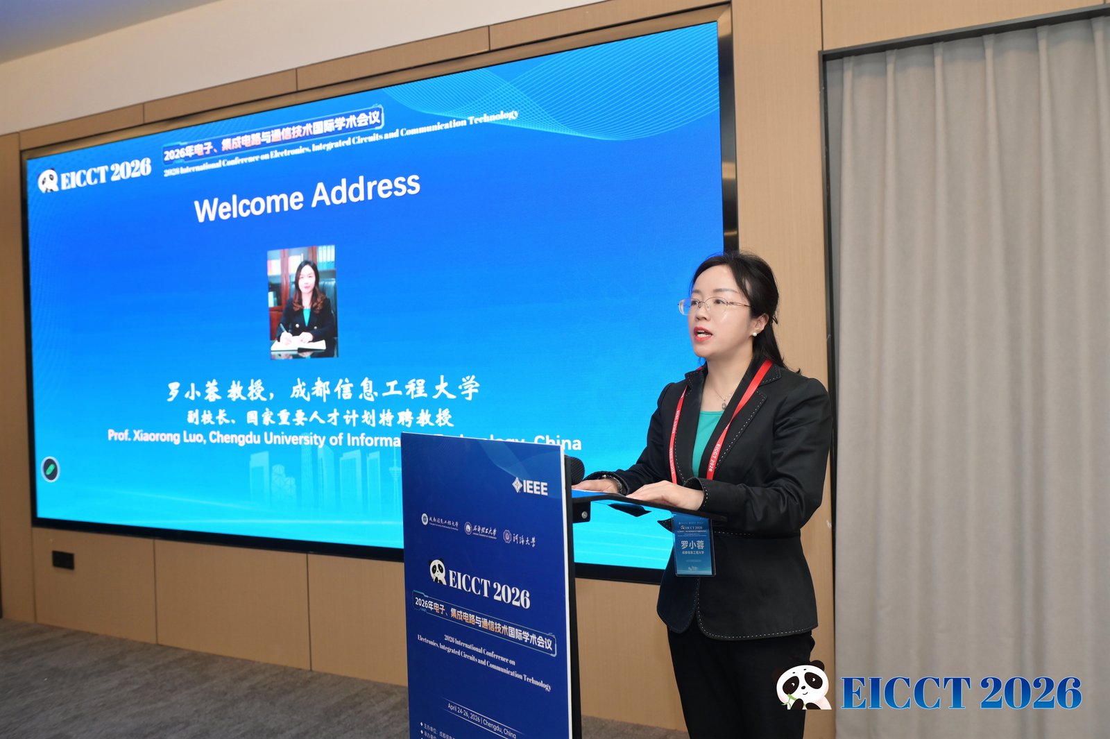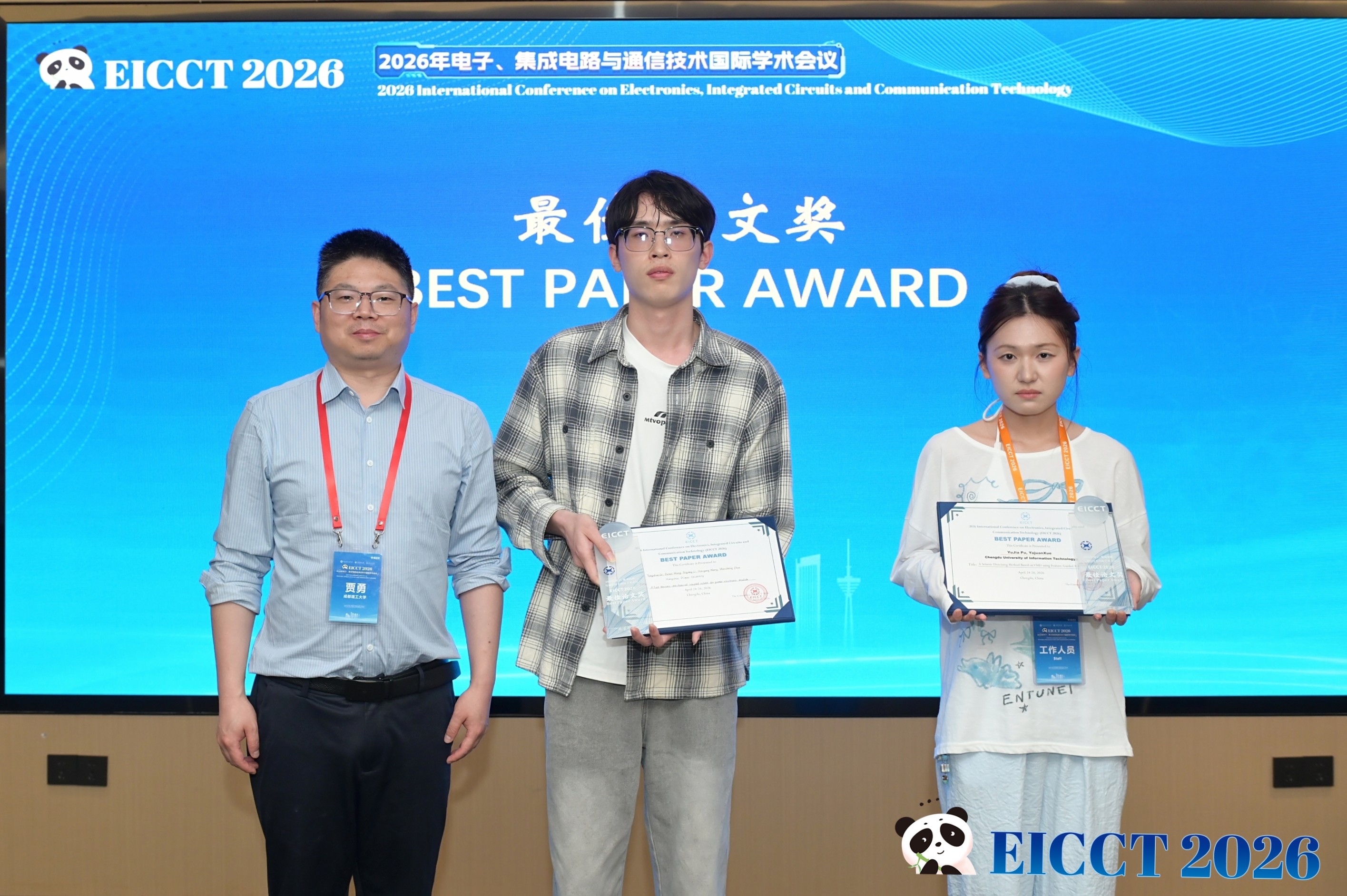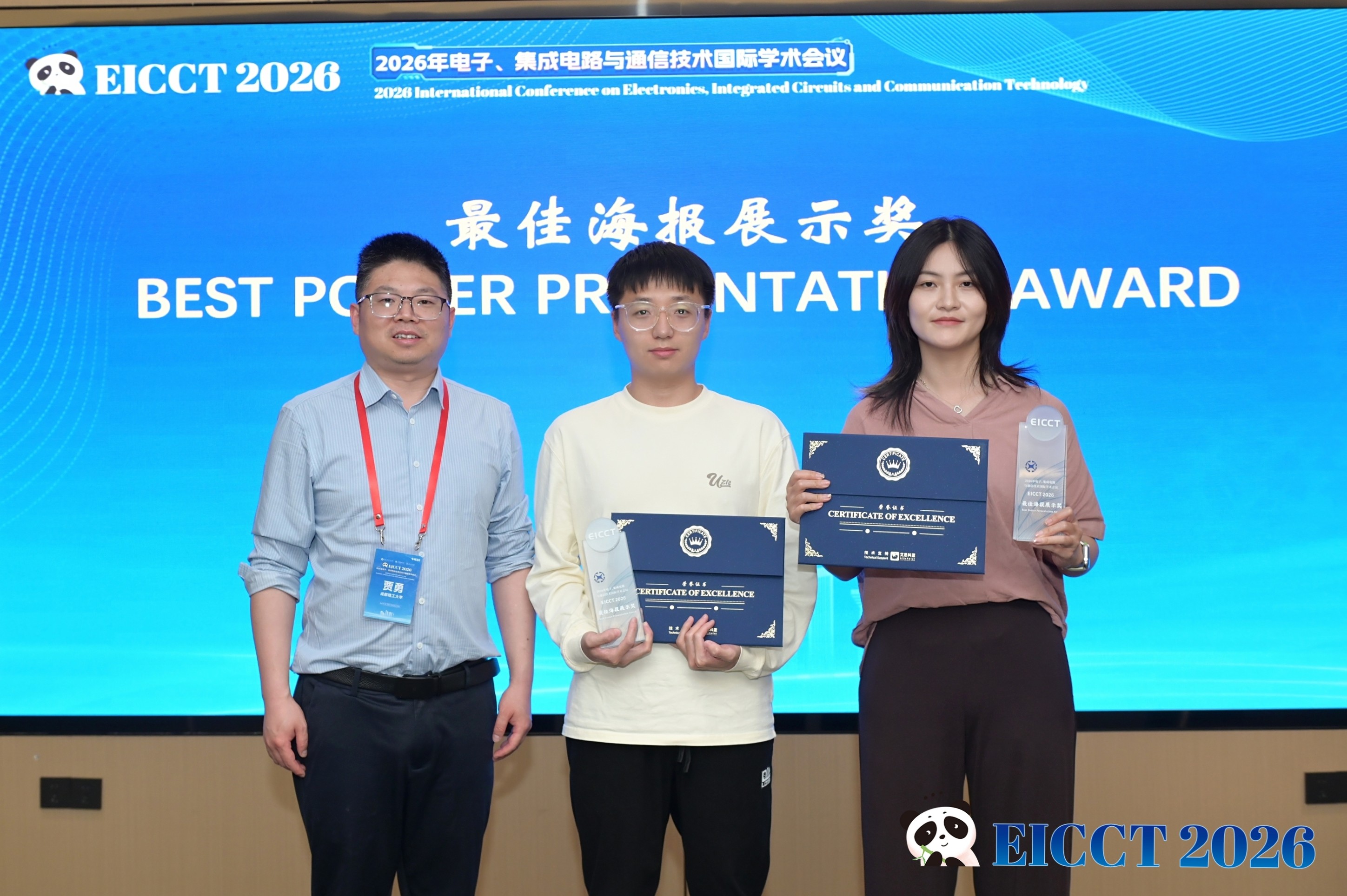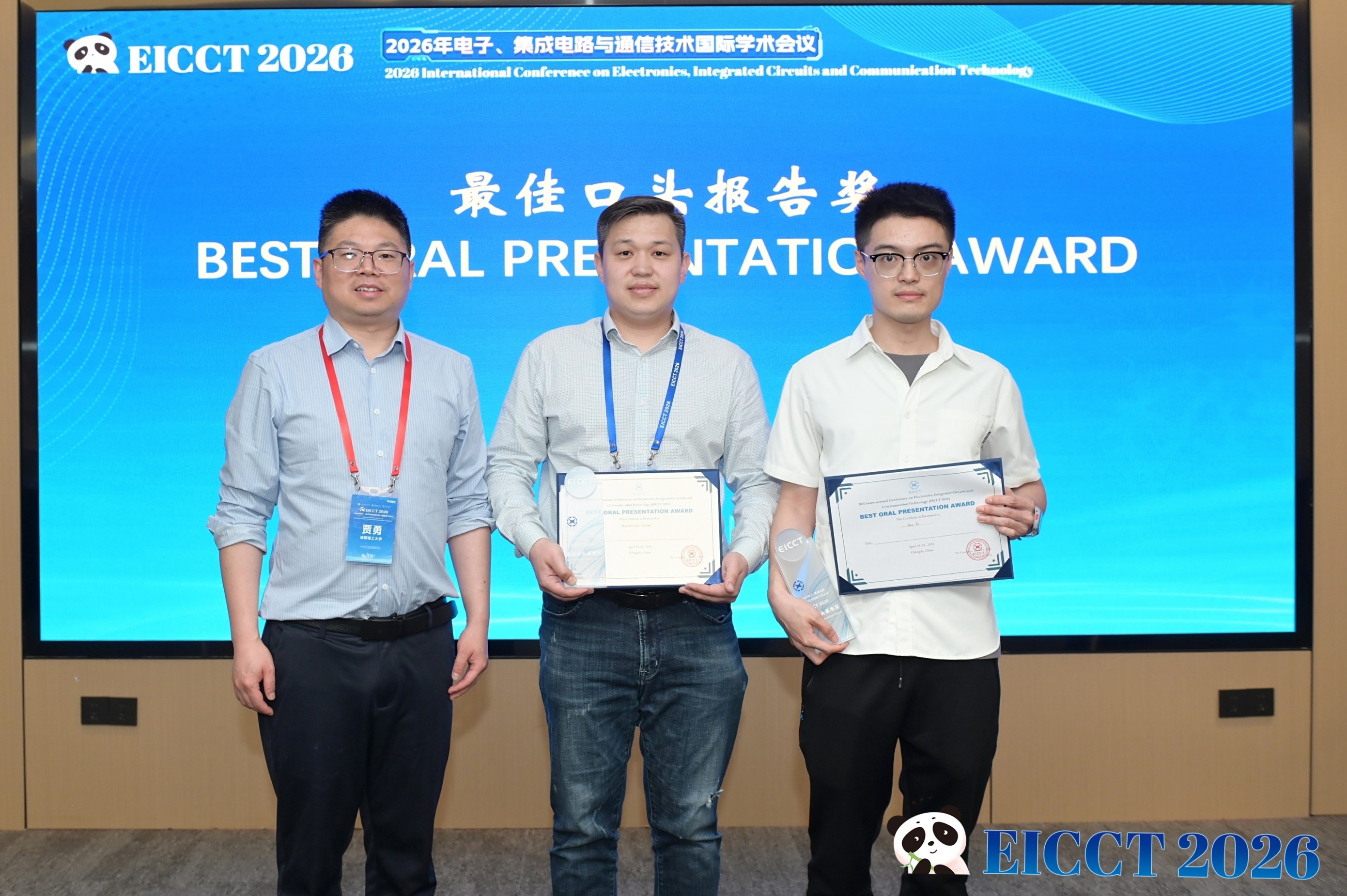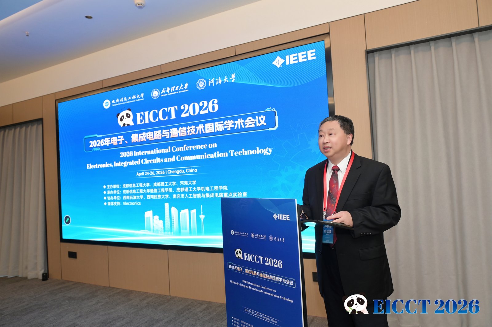 【本网讯】4月24日至26日,2026年电子、集成电路与通信技术国际学术会议(EICCT 2026)在成都圆满落幕。会议由成都信息工程大学、成都理工大学、河海大学联合主办,成都信息工程大学通信工程学院、成都理工大学机电工程学院承办,西南石油大学、南充市人工智能与集成电路重点实验室协办,并获得Electronics期刊的支持。会议设置了主讲报告、口头报告、海报展示、茶歇交流、评奖评优等环节,吸引了国内外近两百人参会,共同探讨相关领域的前沿技术与未来趋势。