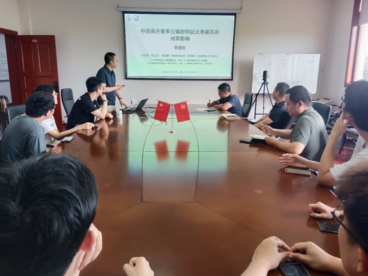 【本网讯】5月27日下午,中国科学院大气物理研究所李剑东研究员在气象楼310会议室,作题为《中国南方春季云辐射特征及青藏高原强迫对其影响》的学术报告。本次报告由大气科学学院副教授吴小飞主持,副院长华维,教授赵勇等部分师生参加了现场报告和学术交流。