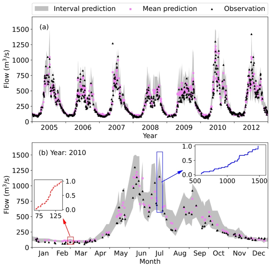 【本网讯】近期我校管理学院张茜茜以成都信息工程大学为第一单位,在地球科学领域公认的国际顶级期刊《Journal of Hydrology》(中科院一区,IF=6.4)上发表题目为“Bagged stepwise cluster analysis for probabilistic river flow prediction”的论文。该文章针对河水的径流预测提出了一种基于传统SCA模型与bagging技术相结合的新型ensemble模型,即BSCA模型,克服了传统SCA模型在数据稀疏区域(例如:径流极值)预测不准确的问题并提升了整体的预测准确度。此外,BSCA还可以通过结合probabilisticprediction的方法来量化径流预测值的不确定性,进而指出径流极值的风险大小。本文提出的新型模型展示出较高的径流预测准确度及量化径流极值风险的能力,说明它在未来的洪水控制和水资源管理中具备巨大的发展和实践潜力。