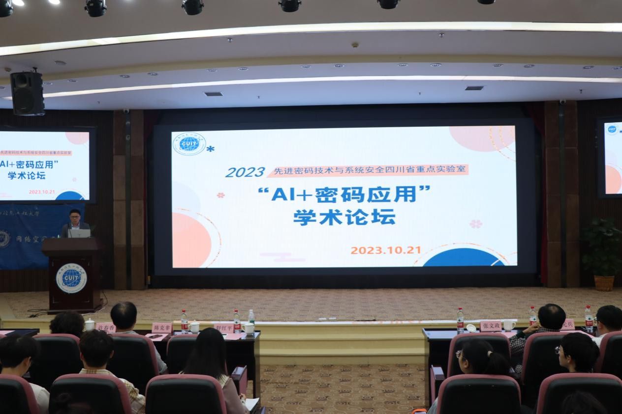 【本网讯】10月21日下午,由学校科技处主办,先进密码技术与系统安全四川省重点实验室和网络空间安全学院承办的2023年“AI+密码应用”学术论坛在成都信息工程大学航空港校区国际会议厅顺利召开。