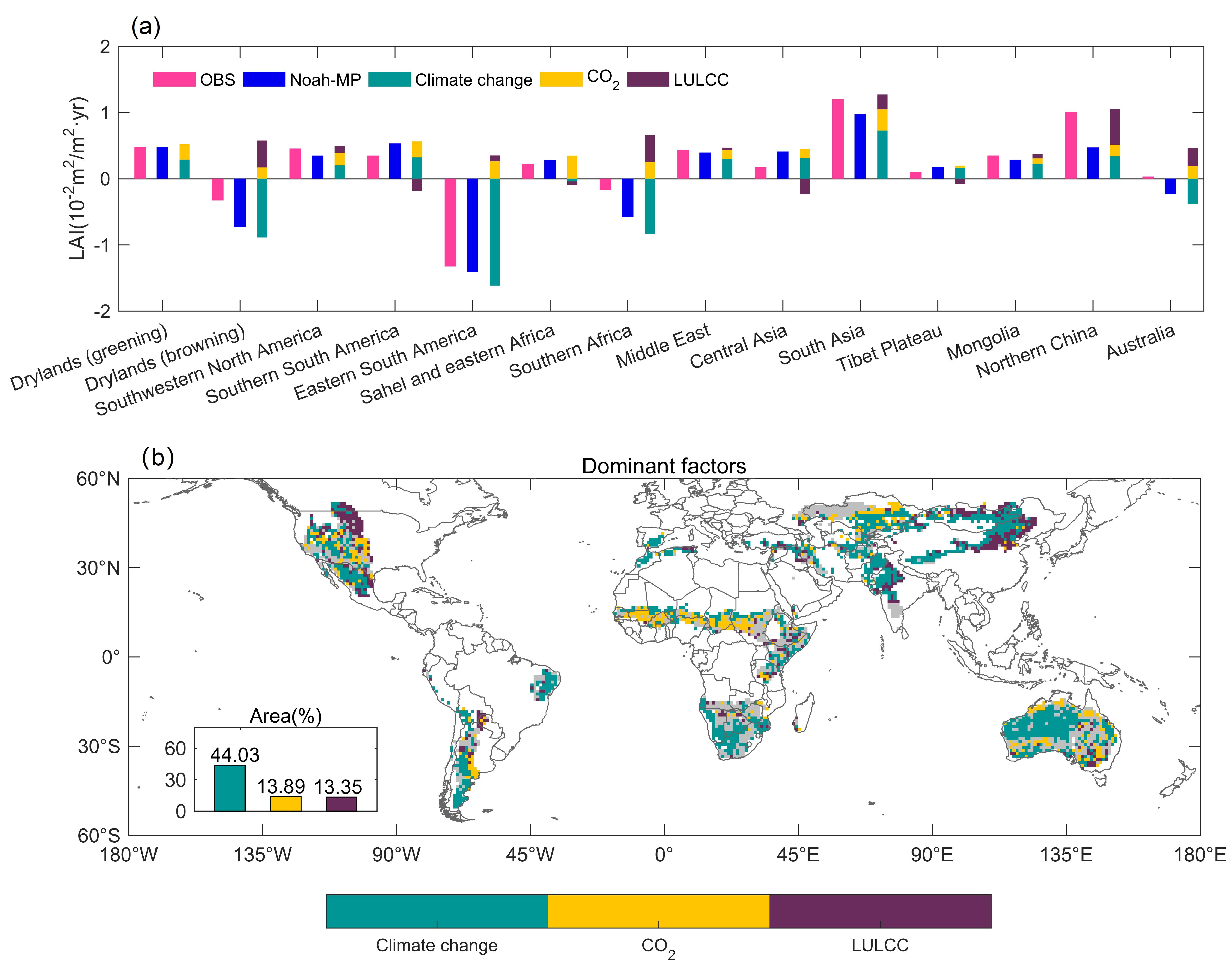 【本网讯】近期我校大气科学学院蹇东南博士与美国亚利桑那大学、中国科学院大气物理研究所、北京大学和清华大学的专家学者合作,利用考虑根系动态吸水过程的Noah-MP陆面模式,量化了气候变化、CO2和土地利用/土地覆盖变化对全球干旱半干旱区植被变化(由叶面积指数表征,LAI)的贡献,论文以题为“Limited driving of elevated CO2on vegetation greening over global drylands”发表在Environmental Research Letters(JCR一区,IF=6.7)杂志上。