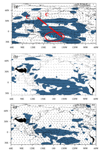 图1(a)200 hPa和(b)850 hPa水平风场以及(c)整层积分的水汽通量对南太平洋副热带海温指数的回归结果