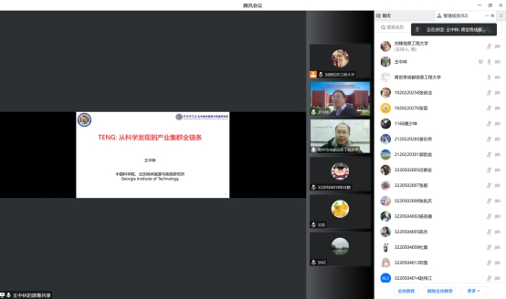 【本网讯】12月9日下午,中国科学院外籍院士、中国科学院北京纳米能源与系统研究所所长、中科院大学纳米科学与技术学院院长、佐治亚理工学院终身校董事、讲席教授王中林应邀通过腾讯会议直播来到成都信息工程大学机器人与智能系统国际联合研究中心系列学术报告大讲坛,为直播间100多名师生带来了一场名为“TENG: 从科学发现到产业集群全链条”的学术盛宴。讲座由本中心执行主任蒋世奇教授主持,吸引了多所高校的多名教师和学生参加。