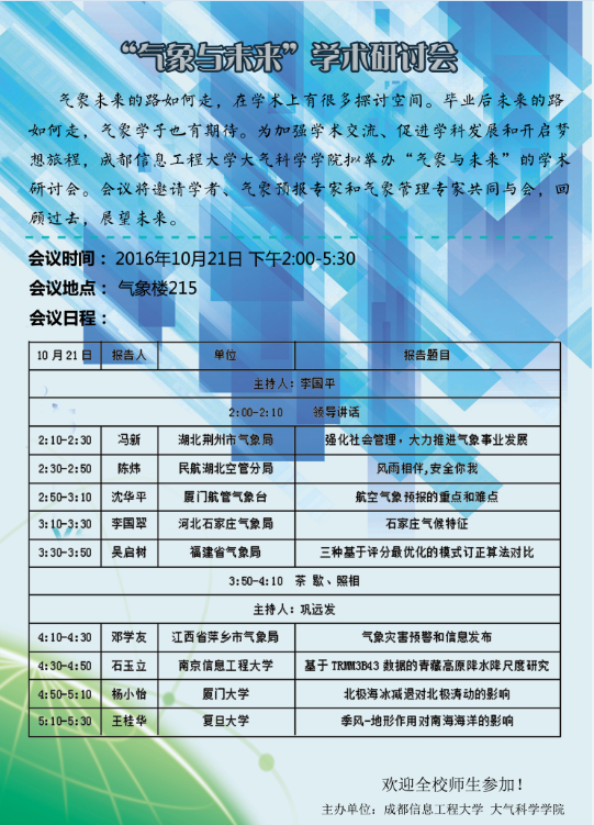 来源:大气科学学院 作者:陈蕾日期:2016-10-17 审核:新闻中心 点击: