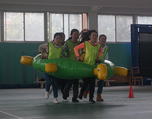 在教练的精心指导下,全院教师分为四个团队,共同出谋划策,设计出队名、队旗、队徽、口号等,并通过队员们的团结协作,先后完成了 “鼓动人心”“神笔马良”“龟兔赛跑”等一系列以激发个人潜能、熔炼团队智慧为宗旨的素质拓展训练项目。