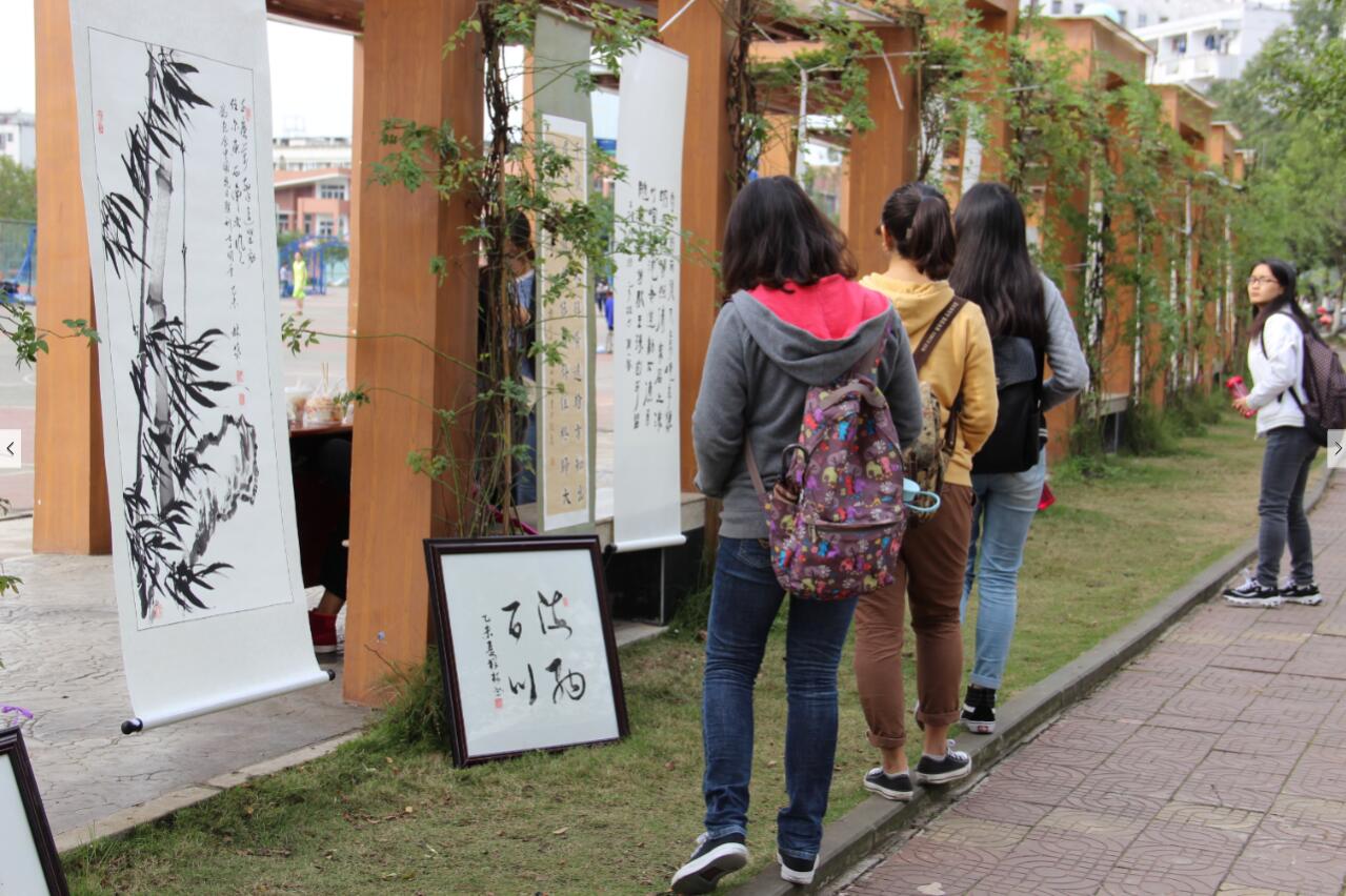上午10点,一幅幅装帧精美的作品悉数展出,作品在青青绿草的映衬下更显雅致,整个长廊顿时显得古色古香,妙趣横生。本次活动共收到紫霞书画院和本校师生作品近百余幅,展出精品60余幅。随后紫霞山书画院7位老师现场题字作画,简笔几支,几抹淡彩便勾勒出一幅栩栩如生的图画。同学们驻足观望,将老师们层层包围,亲身感受书画作品创作过程,老师们也尽量满足同学为其留下一幅幅精美的墨宝。