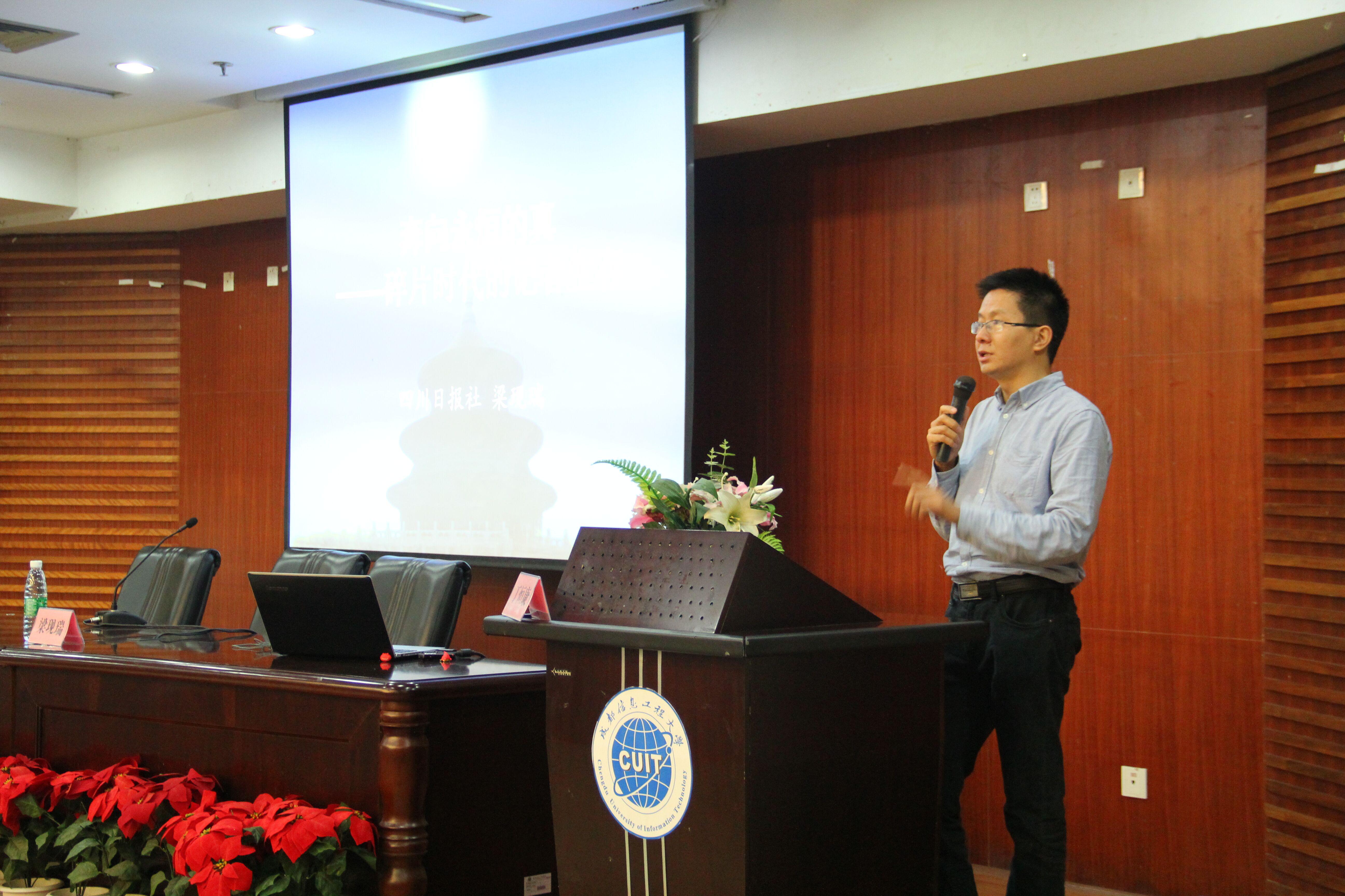 【本网讯】10月14日,由成都信息工程大学宣传统战部主办、新媒体联盟承办的“CUIT校媒菁英汇”系列培训第一场活动在航空港校区学术报告厅举行,本次讲座邀请到《四川日报》的首席记者梁现瑞老师作题为“巨变时代的记者生存”讲座。学校各部门、学院教师代表,校报记者团、新媒体学生代表、各学院学生代表等参加讲座。