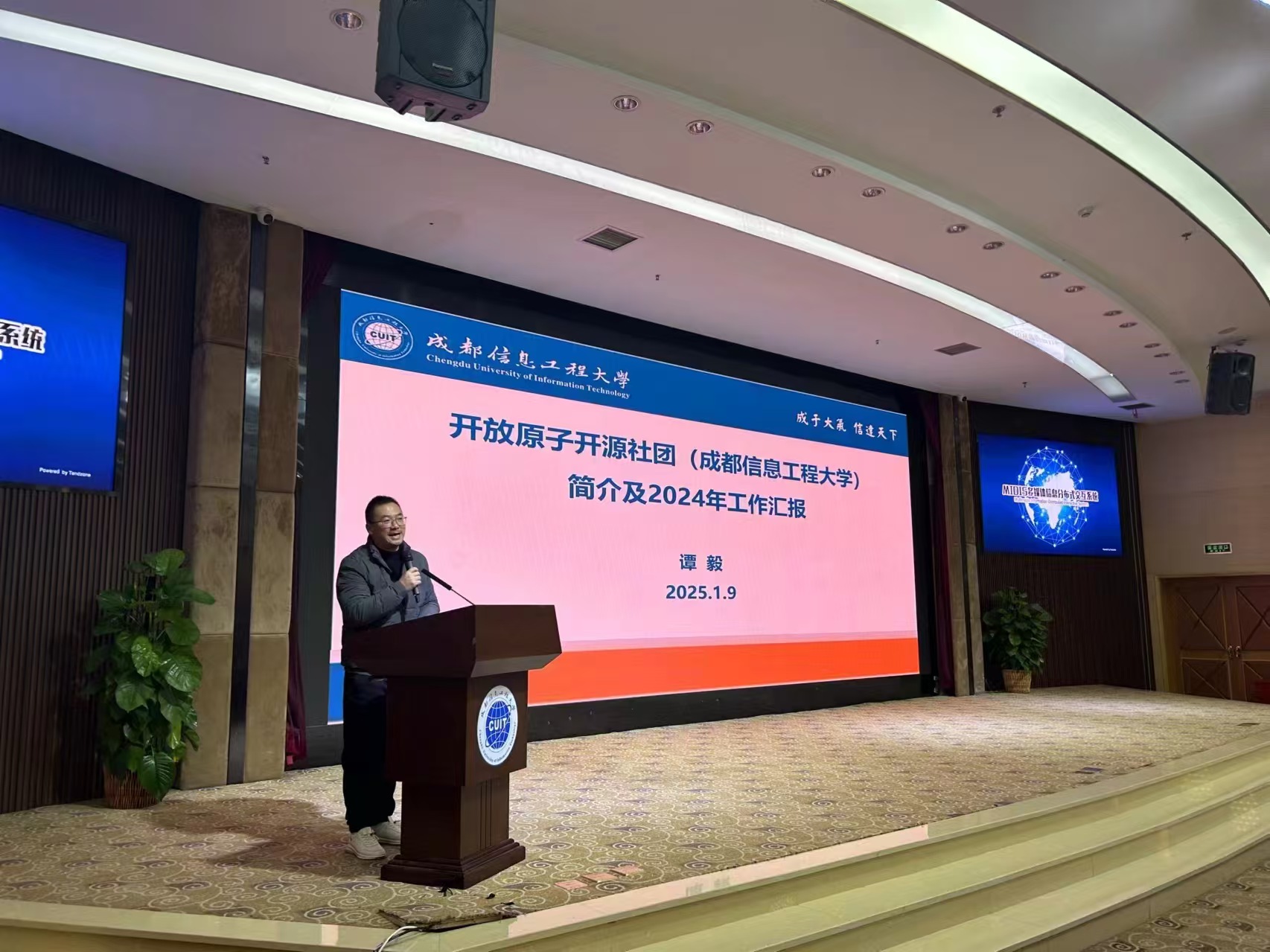 谭毅围绕着开源社团(成都信息工程大学)的成立过程、性质定位、活动开展、相关成果及2025年工作重点进行总结。开放原子开源社团(成都信息工程大学)在校团委的管理和指导下,在2023年3月31日,由成都信息工程大学通信工程学院(微电子学院)向开放原子开源基金会申请,并于同年10月正式挂牌成立。依托通信工程学院(微电子学院)大学生创新实验室,经过一年的建设和发展,现拥有工程实践创新实验室(信达楼B606)、活动及成果展览室(信达楼B609-1)以及社团常务办公室(第一教学楼1205-1)三个场地,建立起完善的组织机构、社团章程和财务管理制度。在2024年度,社团举行了多场开源活动,受到社团成员以及开源爱好者的广泛关注和积极参与。同时,在2024年开放原子校园行“春耕计划”活动中,我校被评为“优秀组织高校”;在2024年度高校社团验收中被授予“‘校源行’活跃社团”称号。2025年,社团将在“对外合作、开源竞赛以及开源人才认证”等方面重点开展工作,进一步提升我校开源活动的品质和开源成果的产出。