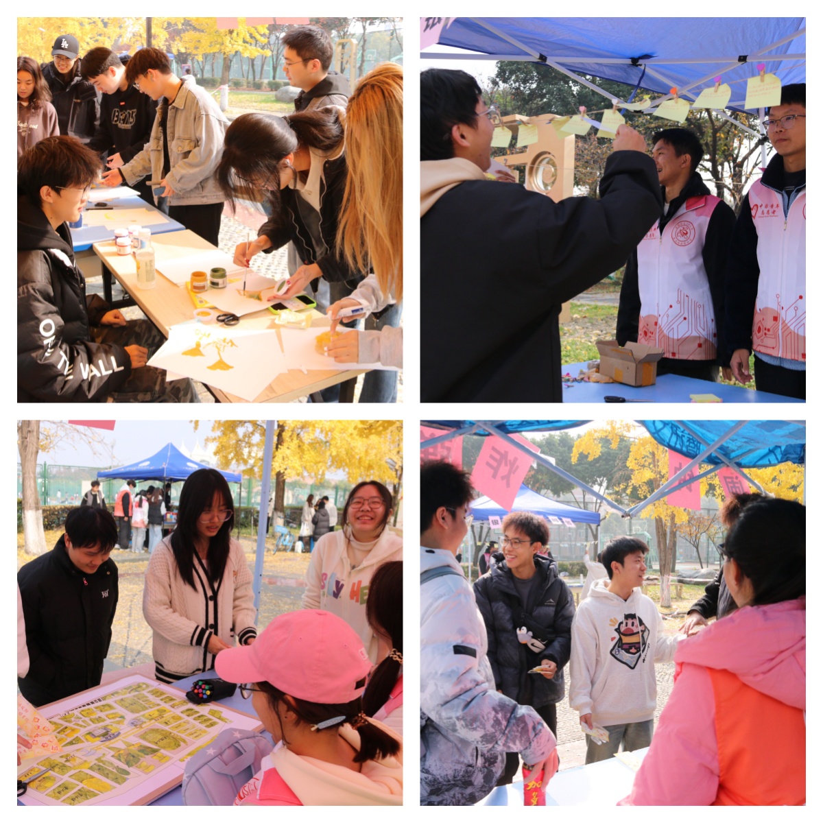 活动以银杏为媒,融艺术、趣味、创作为一体,为师生带来一场别开生面的秋日文化体验。“同心传字”考验团队默契,“秋风唱反调”比拼敏捷反应,“闹钟炸弹”环节笑声不断,“银杏知识问答”将自然教育与专业知识结合。手工创作区尤为受欢迎,同学们将一枚枚金黄的银杏叶转化为“纸上飞舞的银杏”画作与“杏叶艺术相纸”相框,在一粘一贴、一笔一画中感受手作的温度与创作的喜悦。