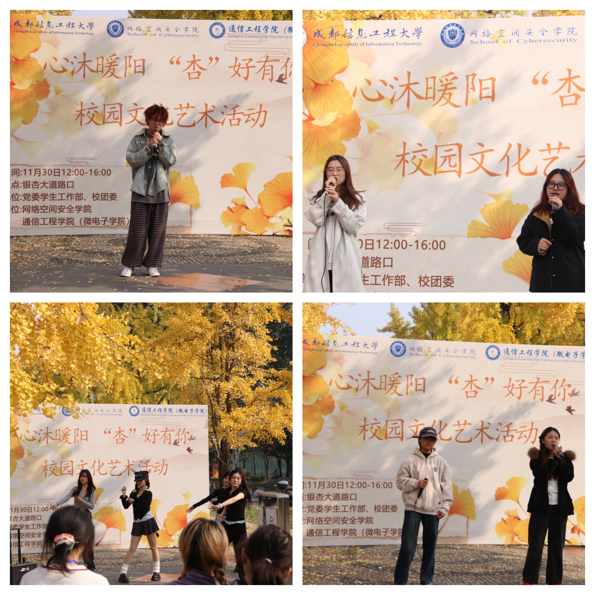 【本网讯】秋韵正浓,杏叶翩跹。11月30日,2025年“杏”好有你校园文化艺术活动在银杏大道温暖启幕。此次活动由学校党委学生工作部、校团委主办,网络空间安全学院与通信工程学院(微电子学院)联合承办。