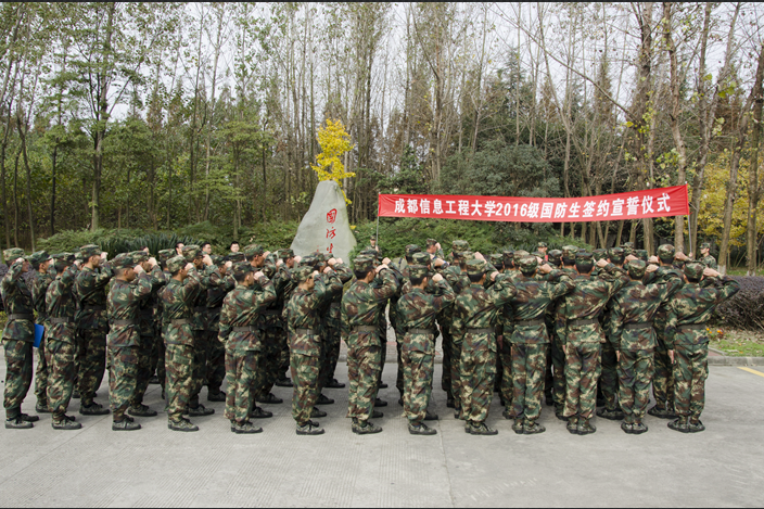 【本网讯】11月29日,成都信息工程大学2016级国防生签约宣誓仪式在学校国防生林举行。学校副校长于世祥,学生工作处处长戴丽红,驻校选培办相关人员及部分高年级国防生代表参加了签约仪式。仪式由学生工作处副处长陈智勇主持。