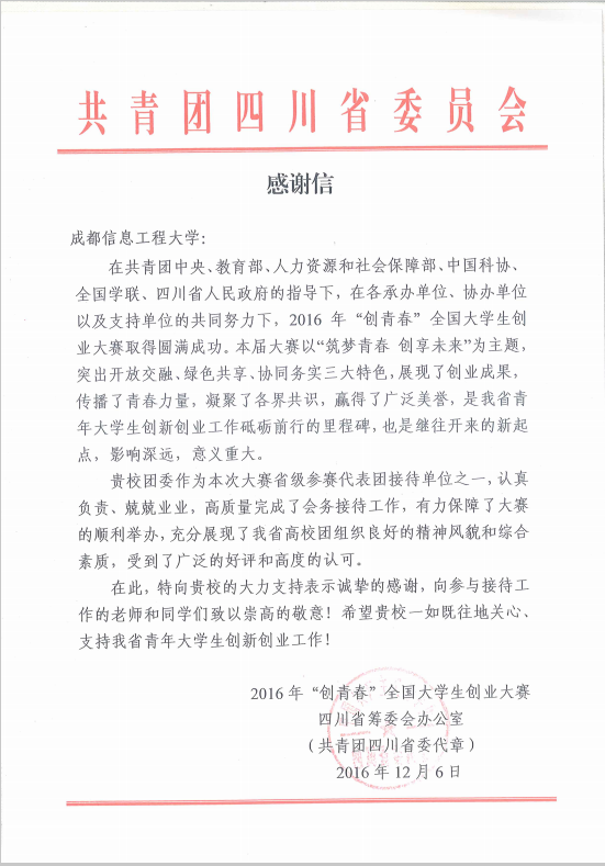 【本网讯】日前,共青团四川省委给我校发来感谢信,感谢我校为2016年“创青春”全国大学生创业大赛的成功举办所提供的巨大帮助和支持,并对我校在省级参赛代表团接待工作中的突出表现给予了高度评价。