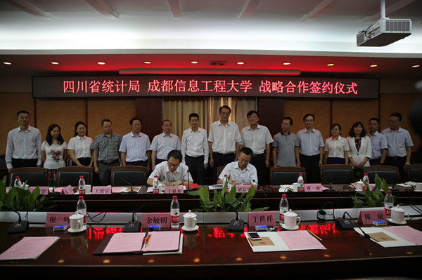 四川省统计局党组副书记、副局长胡品生与学校副校长于世祥分别代表四川省统计局和成都信息工程大学在战略合作协议上签字。