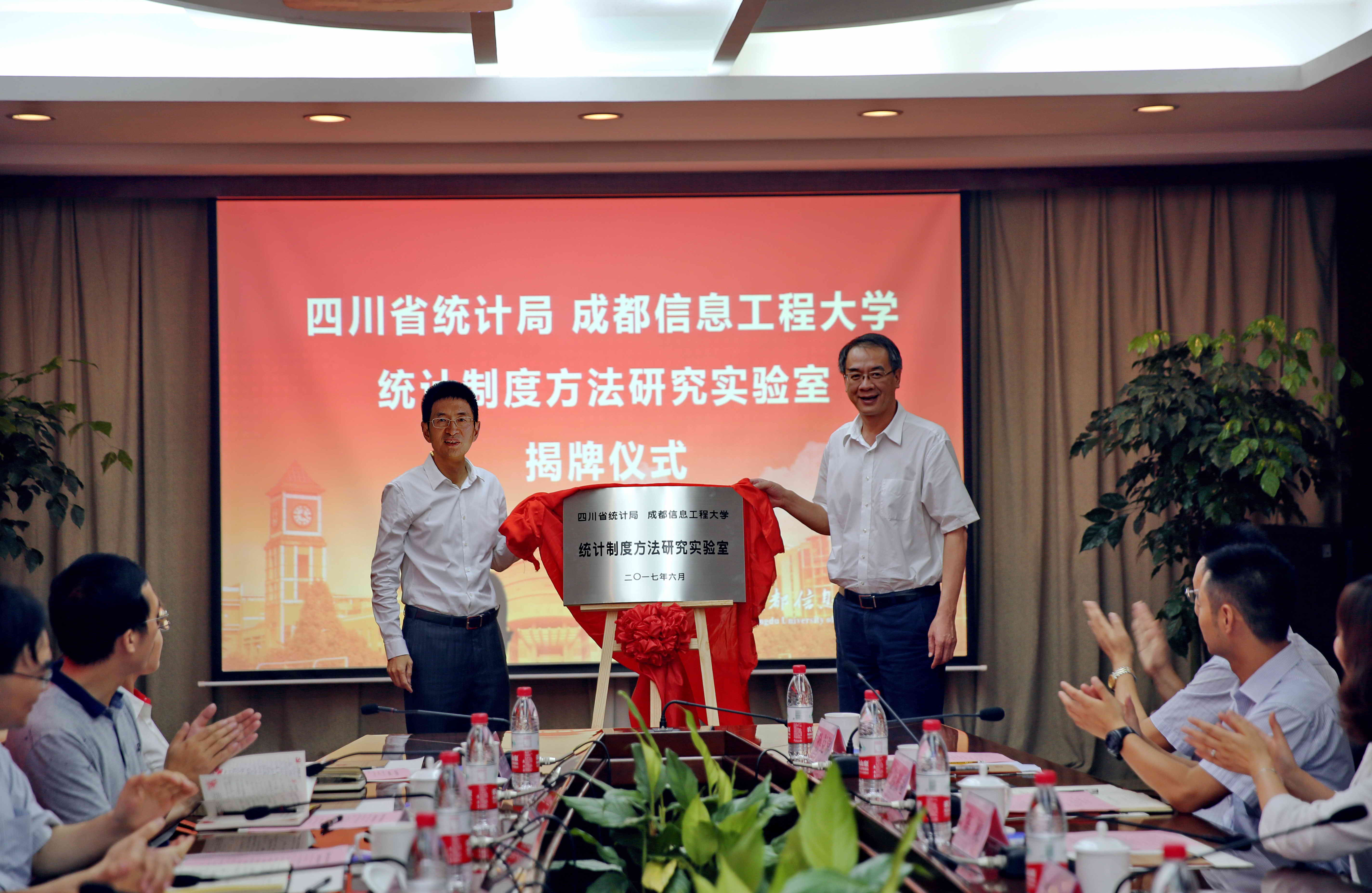签约仪式上,陈炜和余敏明共同为“四川省统计局 成都信息工程大学统计制度方法研究实验室”揭牌。