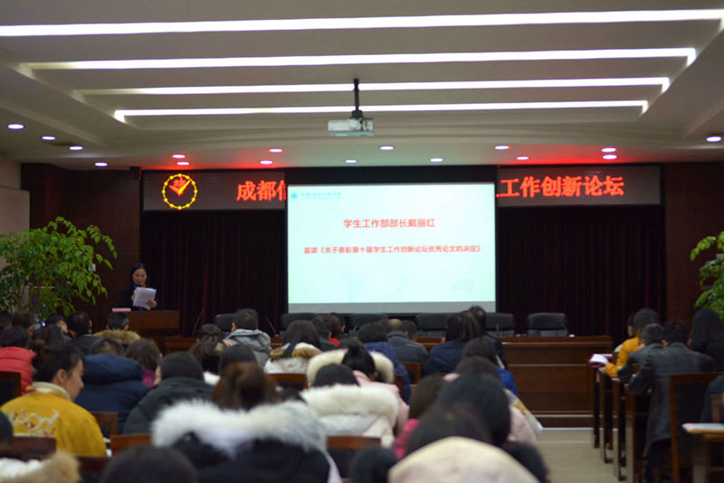 【本网讯】为深入学习贯彻党的十九大会议精神,贯彻落实中共中央、国务院《关于加强和改进新形势下高校思想政治工作的意见》、教育部《普通高等学校辅导员队伍建设规定》和学校2017年党建及思想政治工作会议精神,进一步推进新形势下我校学生工作,加强和改进大学生思想政治教育,创新学生工作的理论与实践,1月10日上午,学校在行政楼一会议室召开第十届学生工作创新论坛。学校副校长于世祥,相关职能部门负责人,各学院党总支书记(副书记),全体辅导员老师等约150余人参加了论坛。论坛由学生工作部部长戴丽红主持。