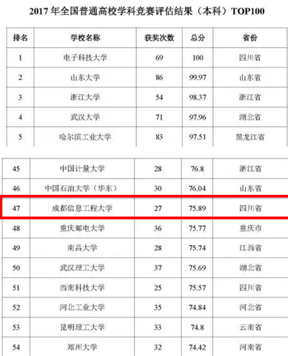 我校在2017年中国高校创新人才培养暨学科竞赛评估结果中位列全国47位,四川省属高校第一