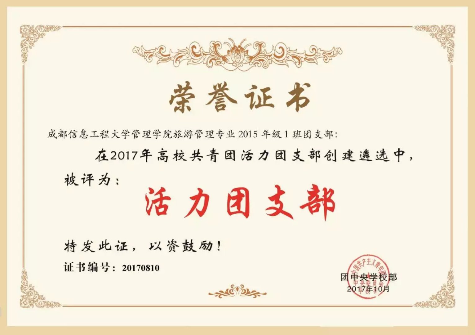 【本网讯】为贯彻落实《高校共青团改革实施方案》有关精神,深入实施高校基层团支部“活力提升”工程,团中央学校部于2017年秋季学期开展高校“活力团支部”创建遴选活动。经校内创建、省级遴选、网络投票等环节,我校管理学院旅游管理2015级1班团支部获评2017年全国高校“活力团支部”。
