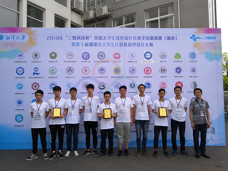 【本网讯】5月13日,2018年“三盟科技杯”中国大学生程序设计竞赛全国邀请赛(湖南)暨第十届湘潭市大学生程序设计大赛在湘潭大学落下帷幕,来自全国60所高校的177支队伍参加了比赛。我校派出了三支参赛队共9名选手参赛,软件工程学院教师黄健为带队教师,经过5小时的激烈角逐,我校三支参赛队伍获得了两银一铜的优异成绩。