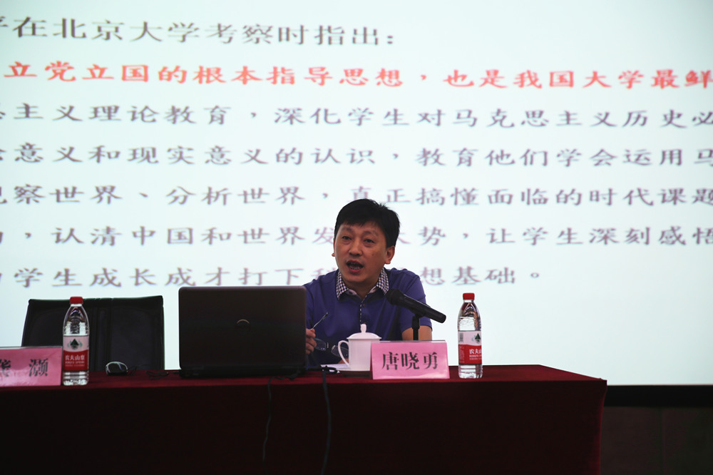 唐晓勇以《坚持把马克思主义作为中国特色社会主义教育最鲜亮的底色》为题进行了宣讲。他指出,马克思主义是人类文明思想成果中最璀璨的真理,至今仍然具有光芒四射的强大精神力量。高校教育工作者要加强马克思主义特别是习近平新时代中国特色社会主义思想的学习研究,扎实理论基础、备足理论“弹药”;要强化创新意识,把握教育规律,改进教学方式方法,使教育教学“活”起来,擦亮育人“兵器”;要坚持“三全育人”,统筹谋划、协同发力,与马克思主义理论教育教学同向同行,形成“同频共振”。他强调,在中国推进世界一流大学建设新征程中,必须牢牢坚持马克思主义及其中国化最新理论成果在高校的根本指导地位,让马克思主义的光辉永远照亮每一个学生的心灵,让马克思主义及其中国化最新理论成果的教育教学永远成为中国特色社会主义大学最鲜亮的底色。