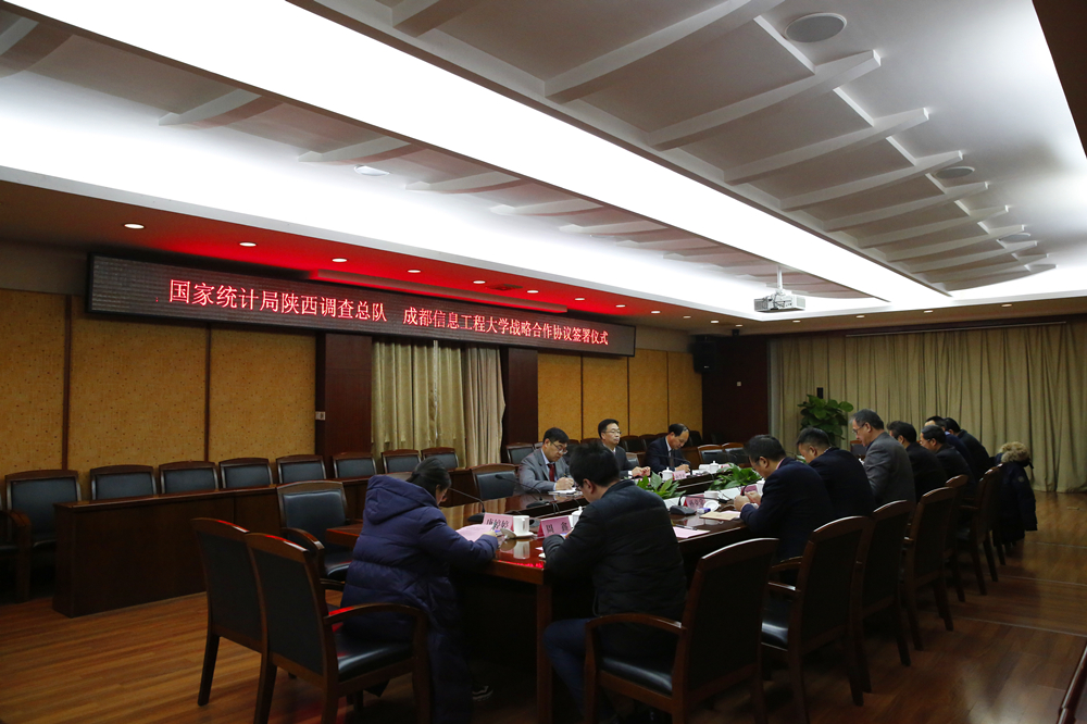 【本网讯】12月24日上午,学校与国家统计局陕西调查总队战略合作协议签署仪式在航空港校区第七会议室举行。国家统计局陕西调查总队党组书记、总队长孙学光,副总队长程海营,办公室主任韩国军,学校校长余敏明,副校长于世祥、舒红平,相关职能部门和学院负责人参加了会议。会议由舒红平主持。
