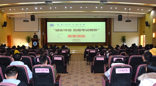 会上,学生工作处梁念老师宣读《成都信息工程大学考试违纪作弊处理办法》(摘要)等文件。教务处谭洁老师代表全体教师作监考承诺。校学生会主席尹博文带领全体同学作诚信考试宣誓。