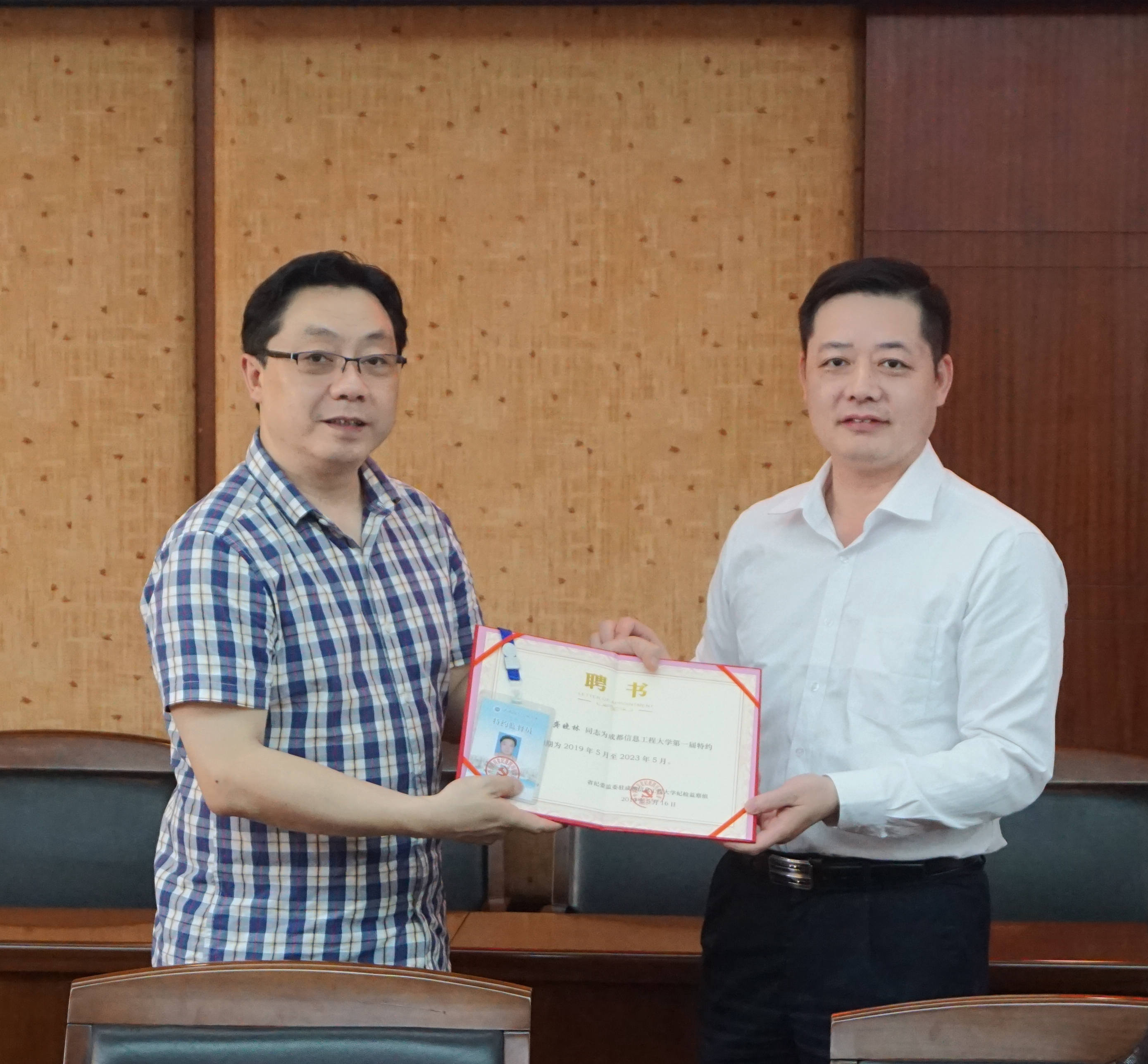 【本网讯】5月16 日,省纪委监委驻成都信息工程大学纪检监察组召开首届特约监督员聘任大会暨校内巡察工作培训会。驻校纪检监察组组长雷超为特约监督员颁发聘书并作讲话。