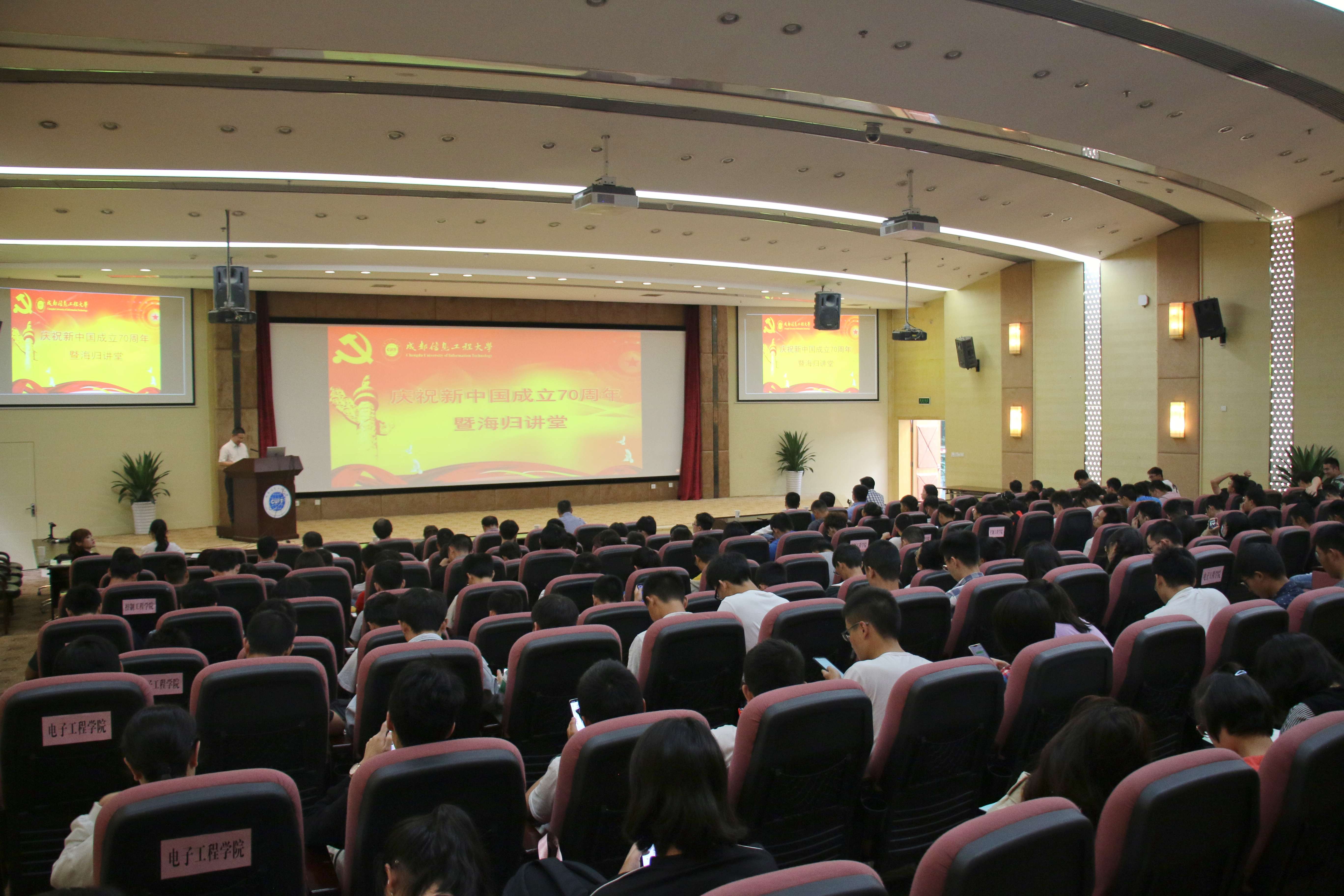 【本网讯】在迎接新中国成立70周年之际,9月27日下午以“奋斗新时代”为主题的海归讲堂活动在我校国际会议厅举行,这是我校首次举办海归讲堂。参加本次活动的有学校副校长、九三学社成都信息工程大学委员会主委范广洲,我校省市区人大代表、政协委员,学校各民主党派、知识分子联谊会、海外归国留学教师代表,学生工作处、党委统战部以及各学院的师生代表。会议由党委常委、党委组织部部长、统战部部长董一平主持。