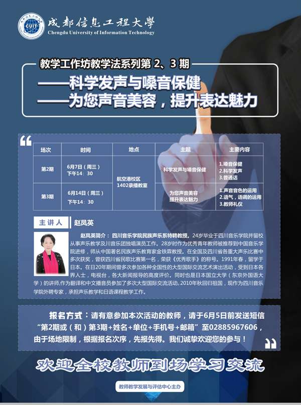 为帮助我校教师掌握科学发声与嗓音保健的技巧,提升表达魅力,学校教师教学发展与评估中心将开展两场“教学工作坊”教学法系列活动,我们诚挚欢迎您的参与!活动安排如下: