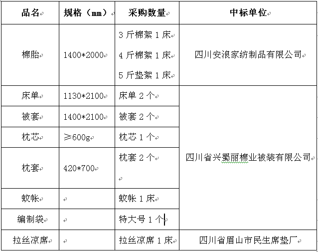 根据四川省纤维检验局提供的质量标准和《成都信息工程大学学生公寓床上用品招标公告》的要求,我校招标小组于2017年6月13日对投标单位提供样品的质量和价格进行综合比选评标,拟确定2017年学生公寓床上用品的中标单位如下: