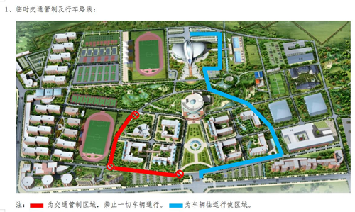 三、交通管制示意图(见附件)进校园请按照临时交通管制示意图安全行驶,“蓝色划线”区域为车辆往返行驶区域,“红色区域”为交通管制区域,禁止一切车辆通行。