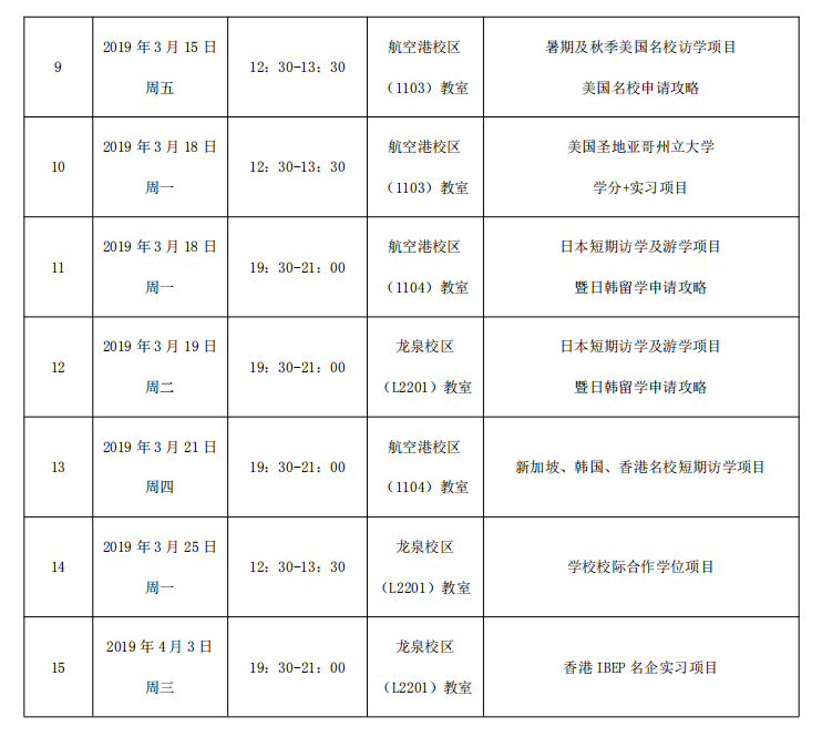 为了让我校学生更充分了解学校出国(境)留学项目,加深对学校出国留学相关政策和选拔流程的理解,鼓励更多优秀的学生赴海外院校学习深造,国际交流与合作处将于3、4月集中为广大学生进行政策解读并邀请我校有留学经历的学生做经验分享,欢迎有意留学海外的同学们积极参加宣讲会。现将宣讲会具体安排通知如下:
