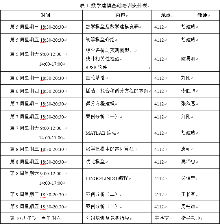 为了培养我校学生的创新意识及运用数学方法和计算机技术解决实际问题的能力,应用数学学院2019年继续组织和指导大学生数学建模竞赛系列活动,竞赛主要包括:全国大学生数学建模竞赛选拔赛(即五一数学建模竞赛),2019年全国大学生数学建模竞赛,全国高校密码数学挑战赛等。应用数学学院数学建模指导组从第五周到第十周开始培训,分别从数学建模基础、数学建模算法、数学建模竞赛、数学建模案例分析到常用软件等方面进行培训,欢迎对数学建模及数学建模竞赛的同学积极报名参加培训,培训安排见表1。