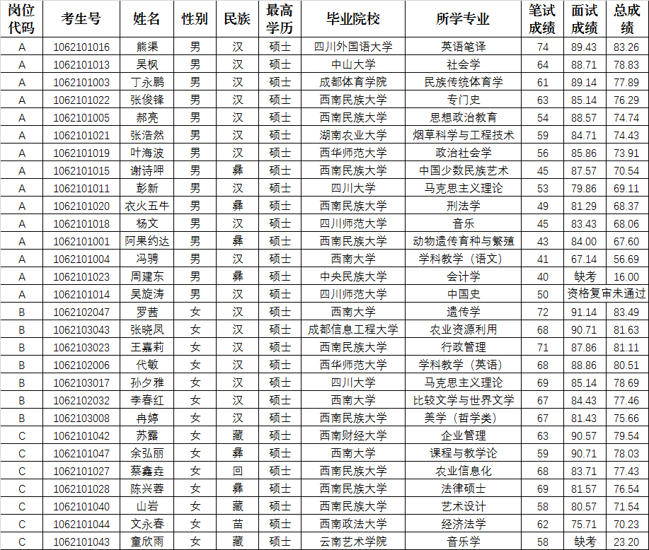 成都信息工程大学2019年公开招聘合同制专职辅导员A、B、C岗面试已于2019年7月24日结束,现将面试成绩和总成绩予以公布。根据《成都信息工程大学2019年公开招聘合同制专职辅导员公告》,考试总成绩以笔试成绩占40%、面试成绩占60%加总计算。现分岗位按总成绩排名予以公布,公布名单详见附件。