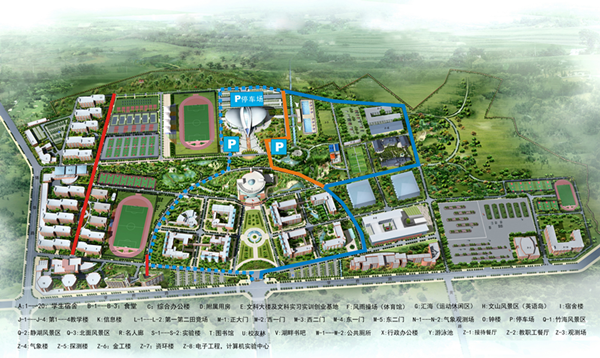 大型车辆:正大门-→行政办公楼-→信息楼-→国际会议厅北入口-→体育馆-→第二运动场路口-→图书馆后门沿荷花池路口-→第一田径场-→20栋路口左转-→正大门驶离。