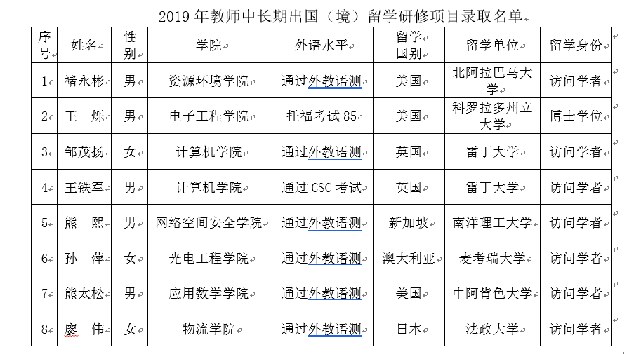 根据《成都信息工程大学教师中长期出国留学研修管理办法》(成信校发【2018】155号)文件的相关要求,我校2019年教师中长期出国(境)留学研修项目共录取8人,现将录取人员名单公示如下: