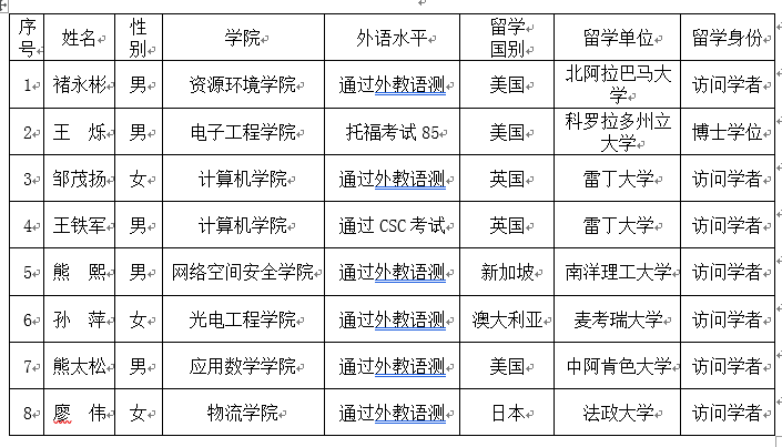 根据成都信息工程大学《教师中长期出国留学研修管理办法》(成信校发〔2018〕155号)文件的要求,我校2019年教师中长期出国(境)留学研修项目共录取8人。现将录取人员名单公布如下: