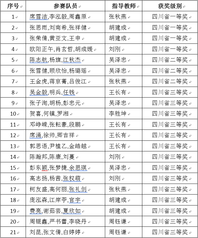 日前,从全国大学生数学建模竞赛四川赛区组委会获悉,四川赛区成绩揭晓,我校有21支参赛队获奖,其中4支参赛队获四川省一等奖,3支参赛队获四川省二等奖,14支参赛队获四川省三等奖,成绩优异。详细名单如下。
