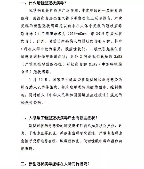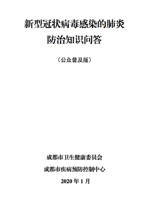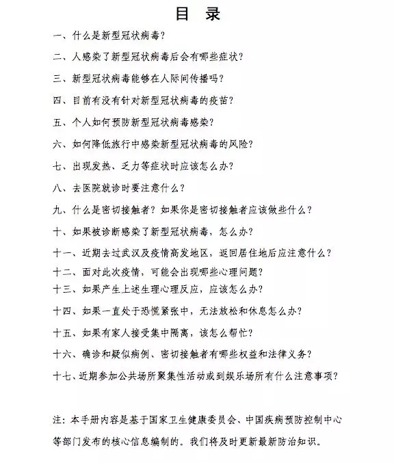 “新型冠状病毒感染的肺炎防治知识问答”手册,内容是基于国家卫生健康委员会、中国疾病预防控制中心等部门发布的核心信息编制,扩散,转存!