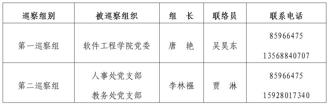 根据《中共成都信息工程大学委员会内部巡察工作实施意见》的规定,按照学校党委巡察工作领导小组的统一部署,学校党委巡察组定于2020年6月10日至6月24日,对软件工程学院党委、人事处党支部、教务处党支部开展校内巡察工作。现将有关事宜公告如下: