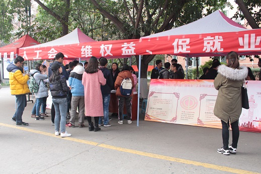 【本网讯】为使我校学子更深入了解工会知识,让应届大学毕业生更好地了解并适应社会生活和工作岗位,尽快实现由“学校人”向“社会人”的角色转变,12月4日至12月8日校工会开展“入工会、维权益、促就业”为主题的工会知识宣传活动周,电子工程学院分团委协助其宣传活动。校工会常务副主席张斌兵,马克思主义学院老师曾利和校工会老师杨小凤、王妍霞以设点宣传、现场答疑的形式面向全校老师和学子宣传工会知识。