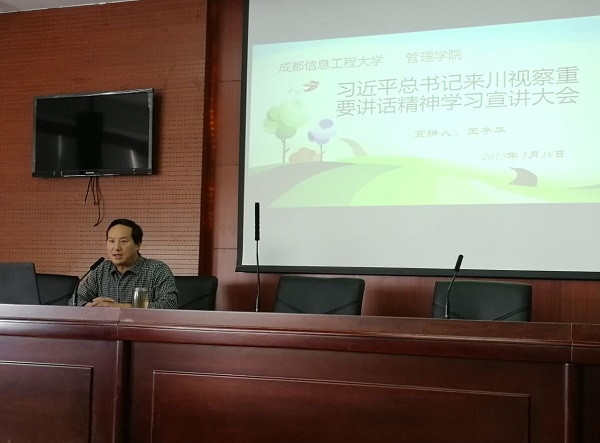 党总支书记王子华做大会宣讲。他主要从习近平来川视察情况;在川视察时的重要讲话精神内容;贯彻落实;学习领悟这四个方面的内容进行领学宣讲。