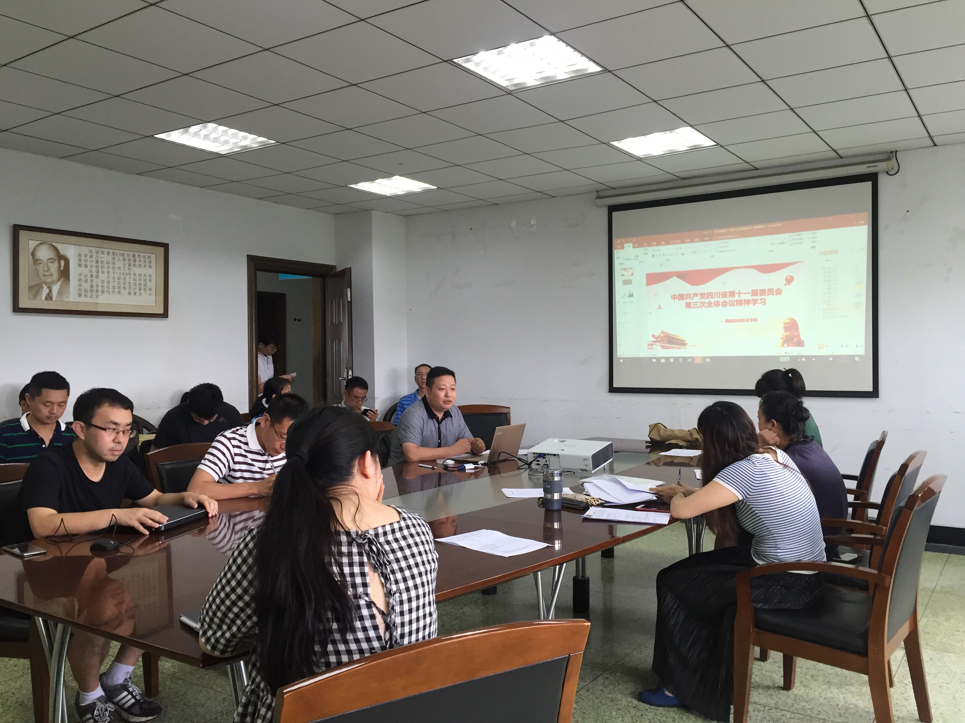 【本网讯】7月4日下午,网络空间安全学院全体教职工在信息楼三会议室开展专题政治学习,学习主题为“中共四川省委十一届三次全体会议公报”。政治学习会由党总支副书记林细俤主持。