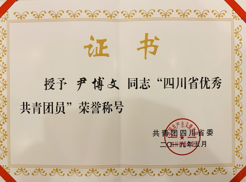 【本网讯】为表彰先进,树立榜样,激励更多团员青年在决胜全面小康、建设经济强省、推动治蜀兴川中发挥生力军和突击队作用,近日,根据共青团四川省委《关于表彰2019年四川省优秀共青团员、优秀共青团干部、五四红旗团委(团支部)的决定》,我校通信工程学院通信工程专业2016级5班尹博文同学荣获“四川省优秀共青团员”称号。